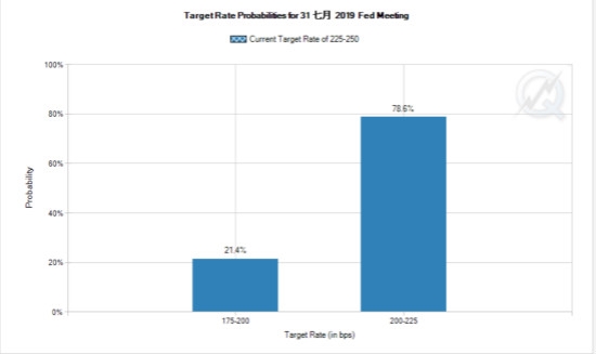 CME“美联储观察”工具显示:目前,市场预计美联储7月降息25个基点至2.00%~2.25%的概率为78.6%,降息50个基点的概率为21.4%。