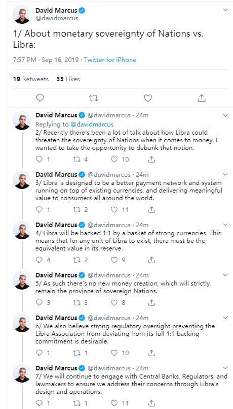 9月16日,就在与各国央行会晤的前夕,Facebook区块链主管、PayPal前总裁David Marcus发推表示,Libra不会像全球监管机构近期宣称的那样,威胁到各国的货币主权。