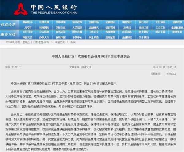 9月27日,央行官网发布公告称,央行货币政策委员会2019年第三季度例会近日在京召开。相比于二季度例会,本次会议在对国内外经济金融形势分析,下一步货币政策部署安排等方面的表述并无明显变化,更多是延续近期国务院常务会议所确定的加大逆周期调节力度、全面做好“六稳”工作等政策基调。