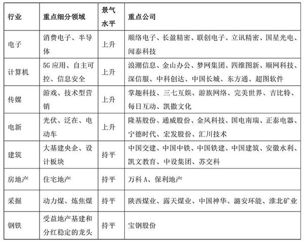 安信证券首选科技,优先重点关注电子、5G应用与新能源汽车,积极关注制造业景气变化。同时,传媒、建筑、地产等板块也获得了集中推荐。