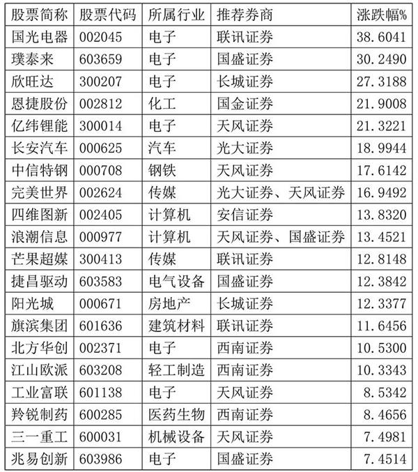 点出11月“最牛金股”的联讯证券,12月继续推荐了国光电器,以及建筑板块表现不俗的旗滨集团。同时,在传媒板块中,将芒果超媒换成了三七互娱。
