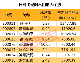 最新数据显示,两市共有51只个股日K线出现阳吞阴形态,当天涨幅最大的是华锋股份、香山股份、意华股份,涨幅分别为10.02%、10.02%、9.99%。