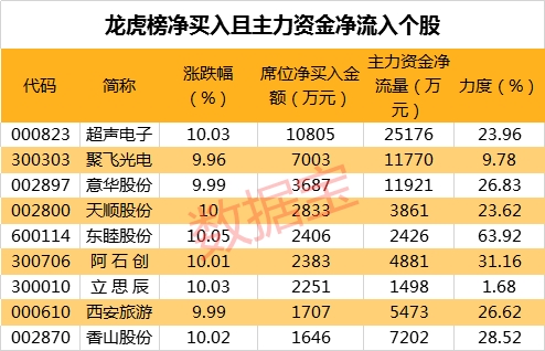 从盘口资金流向来看,主力资金净流入超千万且龙虎榜净买入个股共有12只,其中超声电子、意华股份、聚飞光电等个股资金净流入金额最大。净流入力度最大的个股有东睦股份、联明股份、海伦哲,净流入力度分别为63.92%、40.87%、33.91%。