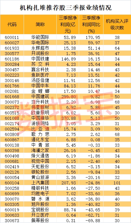 与佩蒂股份一样,前三季度净利润出现下滑的还有15只个股,其中开立医疗、宝钢股份、旭升股份、碧水源、均胜电子等净利润下滑幅度在20%。不过,也有部分股票业绩高增长遭到市场用脚投票,如中国铁建、开润股份、永辉超市、华电国际、华能国际,其中华能国际前三季度实现盈利53.89亿元,同比增长170.95%。至于上述股票是否被机构错看,仍有待市场的进一步检验。