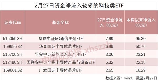 具体看,2月27日,华夏中证5G通信主题ETF、华夏国证半导体芯片ETF、国联安中证全指半导体产品与设备ETF分别净流入7.89亿元、6.99亿元、5.32亿元。本周前4个交易日,华夏中证5G通信主题ETF累计净流入95.30亿元。