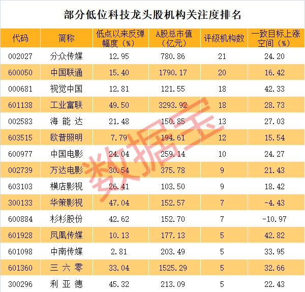 低位科技龙头股仅29只 机构扎堆推荐 多股底部爆量涨停