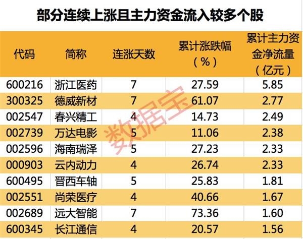 值得注意的是,134只连续上涨个股中,19只个股期间主力资金累计净流入超过亿元。其中,累计资金流入最多的为浙江医药,主力资金累计流入5.85亿元。