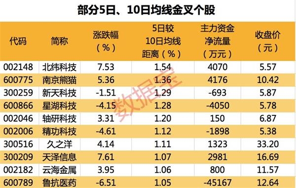 截至最新收盘,有38只A股的5日均线主动上穿10日均线,其中北纬科技、南京熊猫、新天科技等个股的5日均线较10日均线距离最大,分别达1.54%、1.36%、1.29%。