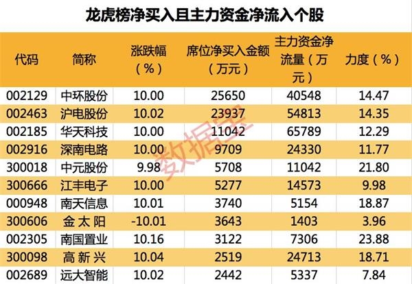 3月10日龙虎榜中机构及营业部席位资金净卖出4.95亿元,其中净买入的个股有19只;净卖出的个股有35只。净买入前三名个股分别是中环股份、沪电股份、华天科技等,净买入金额占当日成交额比例达9.16%、6.26%、2.06%。