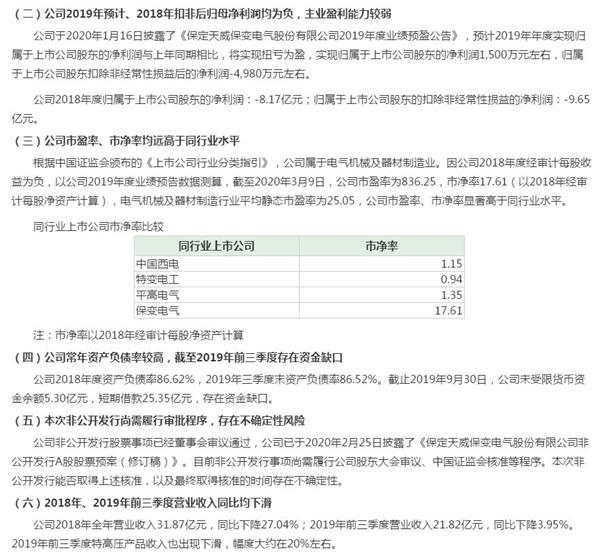 3月10日,保变电气发布的《股票交易异常波动暨风险提示性公告》中,公司方面表示:“因公司2018年度经审计每股收益为负,以公司2019年度业绩预告数据测算,截至2020年3月9日,公司市盈率为836.25倍,电气机械及器材制造行业平均静态市盈率为25.05倍,公司市盈率显著高于同行业水平。”