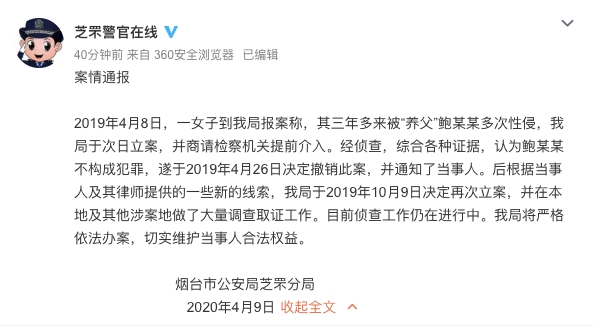 2019年4月8日,一女子到我局报案称,其三年多来被“养父”鲍某某多次性侵,我局于次日立案,并商请检察机关提前介入。经侦查,综合各种证据,认为鲍某某不构成犯罪,遂于2019年4月26日决定撤销此案,并通知了当事人。后根据当事人及其律师提供的一些新的线索,我局于2019年10月9日决定再次立案,并在本地及其他涉案地做了大量调查取证工作。目前侦查工作仍在进行中。我局将严格依法办案,切实维护当事人合法权益。