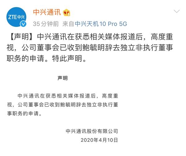 @中兴通讯 4月10日消息,中兴通讯在获悉相关媒体报道后,高度重视,公司董事会已收到鲍毓明辞去独立非执行董事职务的申请。特此声明。