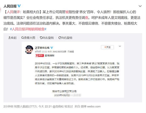@人民日报:某上市公司高管被指性侵“养女”四年,令人骇然!那些摧折人心的细节是否属实?全社会有责任求证,执法机关更有责任调查。呵护未成年人是文明底线,更是法治底线。法律问题须在法治轨道内解决。事关重大,不容烟云缭绕,不容雾失楼台,盼真相大白!