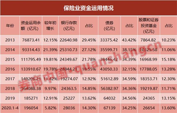 数据显示,今年前4月,保险资金运用额度已经达到了19.6万亿元,其中投资债券额度达到6.7万亿元,占到保险资金运用余额的34.25%,但占比为去年六月以来的低点;此外,险资投资股票和基金的额度规模达到2.67万亿,占到保险资金运用余额的13.60%,占比达到四年来高点。