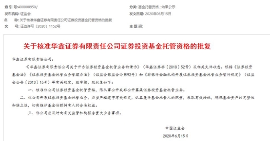6月15日,中国证监会核准华鑫证券的证券投资基金托管资格,华鑫证券成为第19家具有证券投资基金托管人资格的券商,也是今年第二家获批该资格的券商。