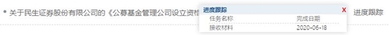 6月18日,证监会官网显示,民生证券《公募基金管理公司设立资格审批》于当日被证监会接受材料。