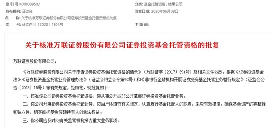 早在一周之前,6月8日,万联证券的证券投资基金托管资格也得到证监会核准。