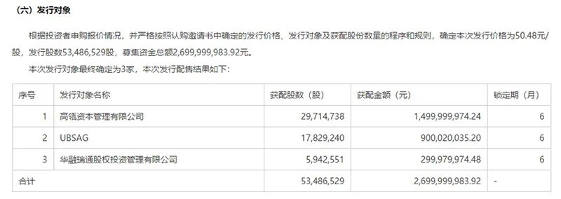 公告显示,知名QFII机构UBS AG(瑞士联合银行集团)出资9亿元,获配1782.92万股,本次发行价格为50.48元,锁定期为6个月。此外,高瓴资本也出资近15亿元,获配2971.47万股,高瓴资本和UBS AG均为合格境外投资者。