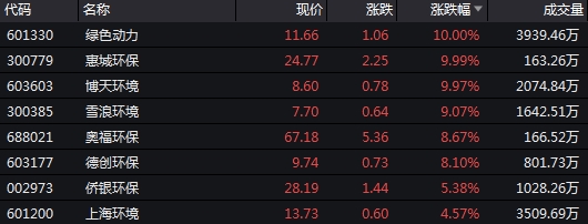 第三个现象是,环保概念股表现亮眼,至上午收盘,环保概念指数涨1.77%,板块内多股涨停,包括绿色动力、惠城环保、博天环境。另外,奥福环保、雪浪环境、侨银环保、德创环保、金科环境等涨幅居前。