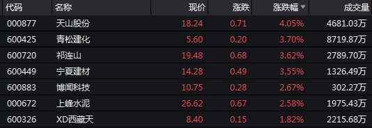 首先,水泥、工程机械等周期品种出现上涨,如Wind西部水泥概念指数涨幅居前,板块内的天山股份、祁连山、青松建化、宁夏建材等表现亮眼。