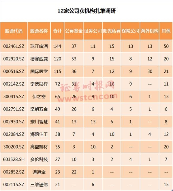 数据显示,个股方面,珠江啤酒累计接待机构达144家,位居首位;德赛西威、国际医学分累计接待120家、115家机构,分别排名第二、第三位。