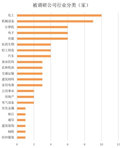按行业分类看,上周被调研公司中,化工行业被调研的公司数量位居首位,共有10家,医药生物行业被调研企业数量排名第二,有 9家公司获机构调研。另外计算机、电子、传媒等3行业或调研公司数量也较多。