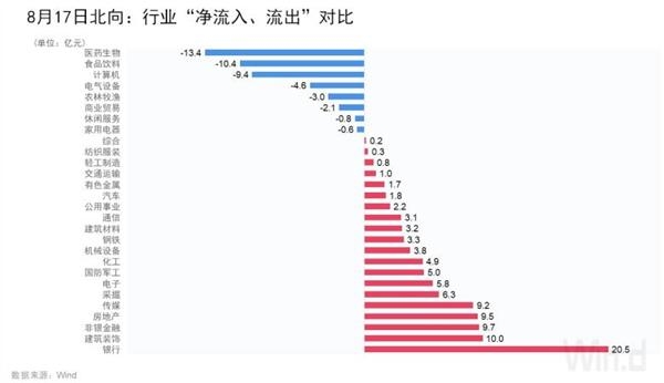 据数据显示,8月17日,从净买入金额上看,北向资金加仓排名前五的行业依次是:银行、建筑装饰、非银金融、房地产、传媒;净卖出方面,金额前五的行业分别是:医药生物、食品饮料、计算机、电气设备、农林渔牧。