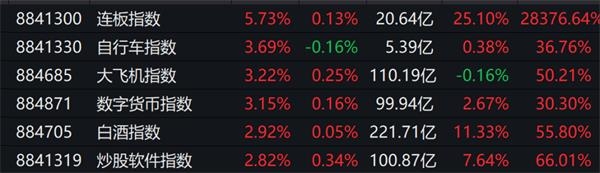 除此之外,当天上午,综合金融、自行车指数、大飞机指数、炒股软件指数等均大涨超3%以上。