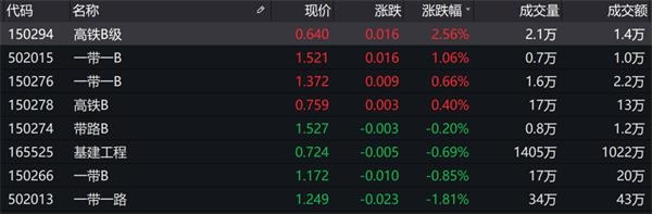 今日两市整体表现低迷,申万28个一级行业全部下跌,场内主题基金同样普跌。交通运输主题基金表现相对较好,其中,高铁B级(150294.SZ)涨幅为2.56%,一带一B(502015.SH)涨幅超过1%。
