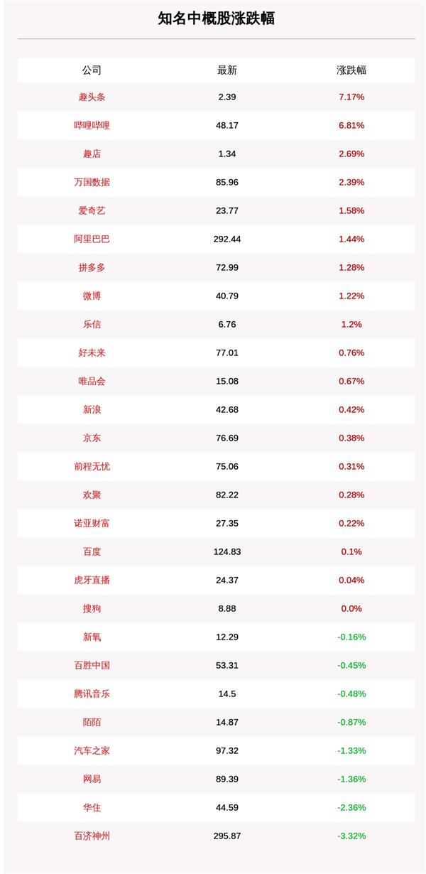 知名中概股中趣头条、哔哩哔哩、趣店、万国数据、爱奇艺涨幅居前,收盘分别上涨7.17%、6.81%、2.69%、2.39%、1.58%。百济神州、华住、网易、汽车之家、陌陌跌幅居前,收盘分别下跌3.32%、2.36%、1.36%、1.33%、0.87%。