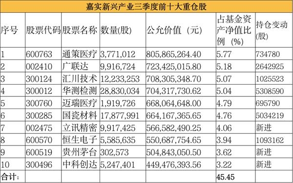 随着基金规模从二季度末的93亿增长至三季度末的140亿,嘉实新兴产业股票此前多只重仓股在三季度都获得不同程度的增持,通策医疗取代广联达,成为其头号重仓股,汇川技术也从二季度末的第六大重仓股晋升为第三大重仓股。