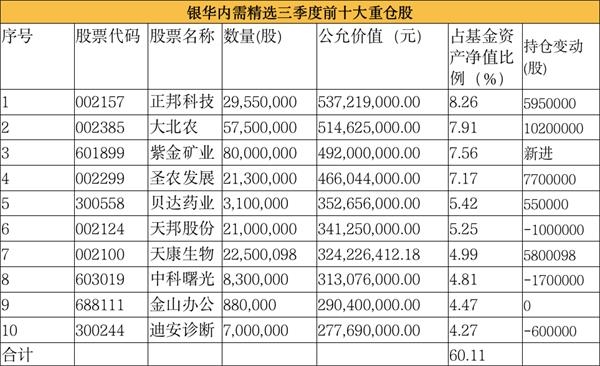 刘辉三季度的前十大重仓股组合整体变化不大,紫金矿业新进其前十大重仓股,对天邦股份、中科曙光等农业及计算机股小有减持。