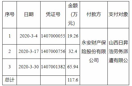 2020年3月,永安财险晋中中支通过财务凭证号为1407000055、1407000756、1407001382的3笔凭证,列支劳务费及调整劳务费,涉及报销金额117.6万元。该费用由永安财险总公司通过快钱转账方式支付至山西日晟浩劳务派遣有限公司,用于支付劳务费,具体情况如下表: