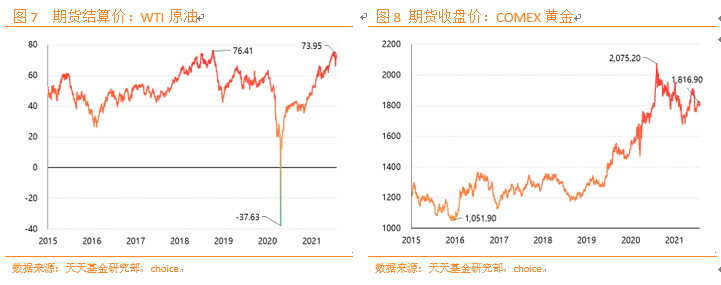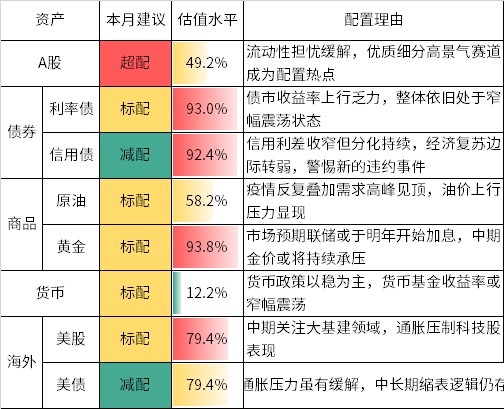 数据来源:天天基金研究部,Choice;各类资产估值参考历史区间的起始日期均为2010年1月1日,如数据首次披露日期晚于该日期,则以首次披露日期为起始日期;截止日期为2021年7月30日。估值水平参考基准:A股为上证综指PE(TTM);信用债为1减去中债中短期票据到期收益率(AAA):5年;利率债1减去为中债国债到期收益率:10Y;黄金为期货收盘价:COMEX黄金;原油为期货结算价:原油为WTI原油;货币为1Y同业存单(AAA+)到期收益率;美股为标普500指数PE(TTM);美债为1减去美国国债到期收益率:10年。估值水平数字计算方式为,截至报告日,各类资产估值在历史所有交易日中所处的水平。估值水平仅代表价格或指标在统计时间内所处相对位置,并不直接应对投资价值。