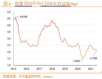 7月中国货币基金月均平均七日年化收益率录得2.15%,较6月基本持平。货币基金收益率持平表明市场短期资金供求平衡,流动性较为宽裕。宏观数据表明经济复苏不稳固、不均衡,通胀压力有限,叠加疫情反复与自然灾害侵袭,货币政策依旧以稳为主,在通胀压力显现前货币基金收益率预计维持窄幅震荡。