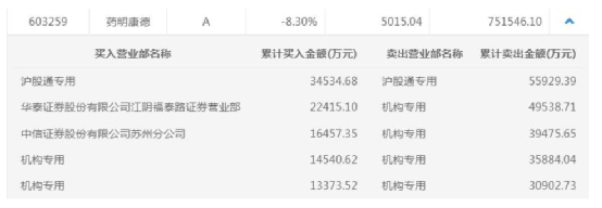 再来看药明康德。今日,药明康德更是遭疯狂砸盘,四家机构集体卖出15.58亿元,沪股通卖出5.59亿元。卖出金额前5名卖出总计21.17亿元,占当天总成交金额28.16%。
