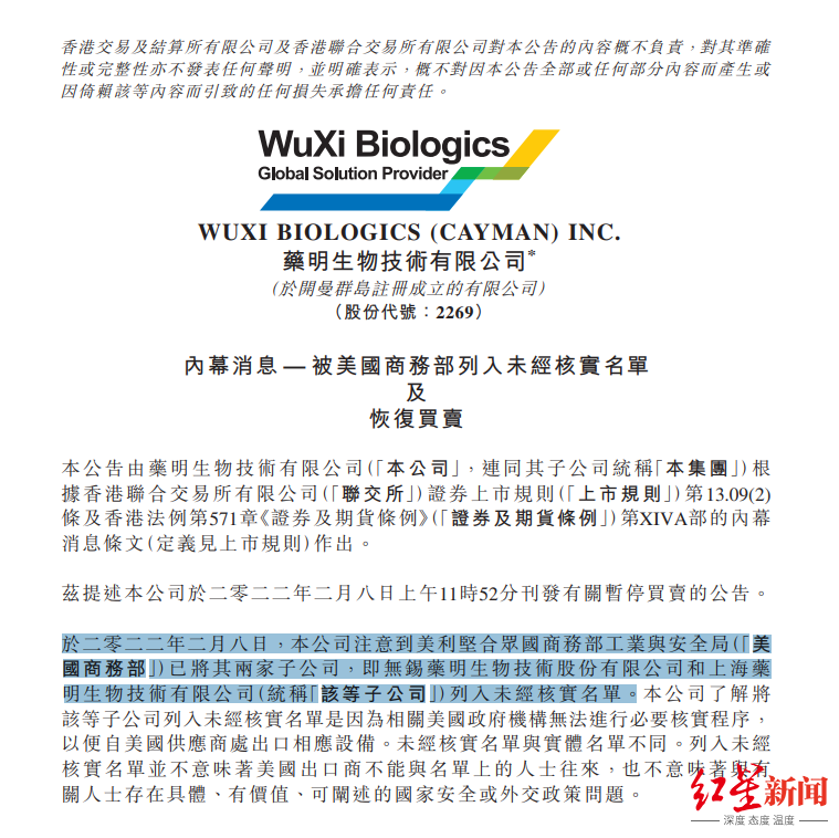 随后,药明康德发声明称,“公司及子公司均未被美国商务部列入‘未经证实名单’,公司目前的各项生产经营情况正常。”