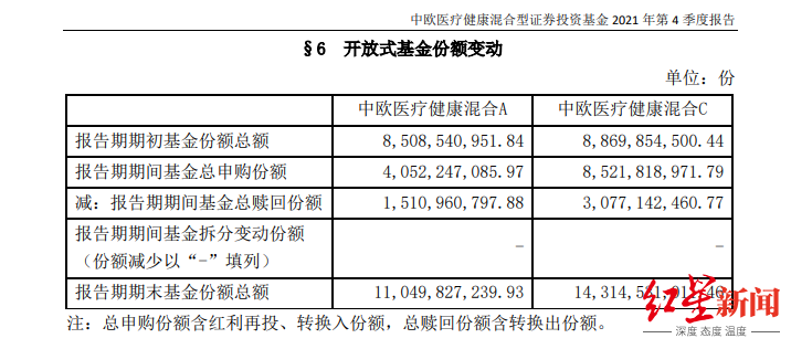 数据显示,去年四季度期间,基民申购中欧医疗健康混合A类份额达40.52亿份,赎回15.11亿份,合计净申购25.41亿份,期末基金份额总额达110.5亿份。