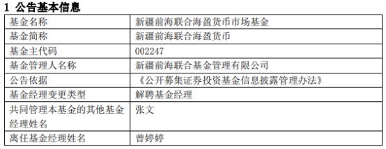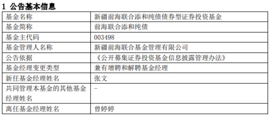 近日,新疆前海联合基金管理有限公司发布基金经理变更公告,曾婷婷辞职并离任前海联合添和纯债(A类003498;C类003499)、前海联合润盈短债(A类008010;C类008011)、新疆前海联合海盈货币。