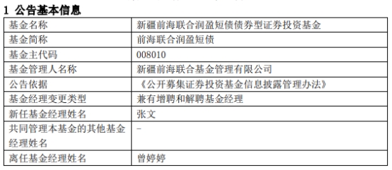 其中,前海联合添和纯债、前海联合润盈短债增聘基金经理张文独立管理,新疆前海联合海盈货币由原共同管理该基金的张文独立管理。