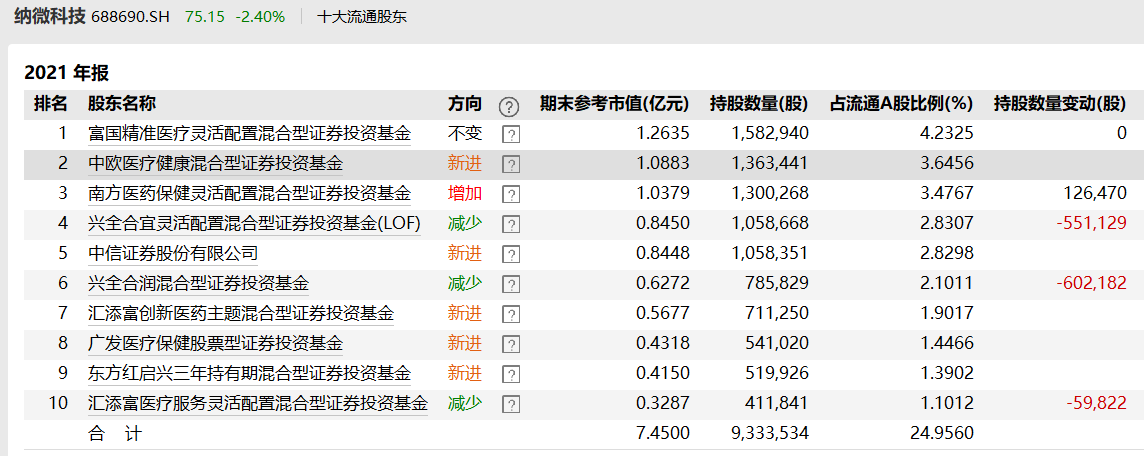 先来看近日披露的纳微科技2021年年报,前十大流通股东名单显示,多位明星基金经理所管的产品均在其中。