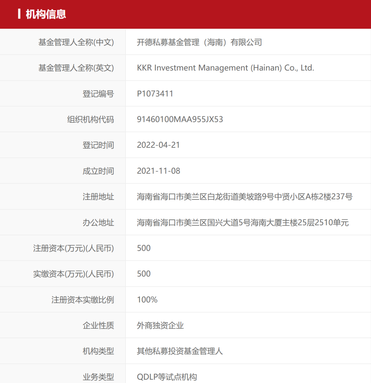 4月21日,开德基金在中基协完成备案。公开信息显示,这家机构是一家外商独资企业,基金管理人的英文全称为KKR Investment Management(Hainan)Co.,Ltd.。注册资本500万元,由KKR亚洲有限公司100%出资设立,成立时间为去年11月,注册地址和办公地址都在海南省海口市美兰区。