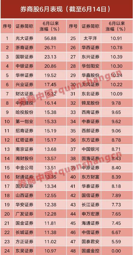 数据显示,6月1日以来,光大证券涨幅57%,浙商证券涨幅27%,国联证券23%,中银证券21%,华林证券20%。