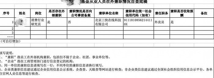 日前,一则“XX基金从业人员在外兼职情况自查底稿”流传于网络。信息显示,这位消费行业研究员在工作之余,还在北京三快在线科技有限公司兼职做外卖员。