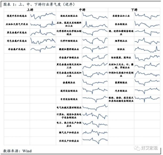 国君宏观从量价入手,利用各行业工业增加值与PPI同比增速变动,将每个行业每月景气度变动情况分为四类并赋值:量的升或降记为+2或-2,价的升或降记为+1或-1,组合得到:+1(量升价跌)、+3(量价齐升)、-1(量跌价升)和-3(量价齐跌)四种情况。(详见《国君总量经济指数系列(一):行业景气及其传导,行业持续走弱》)