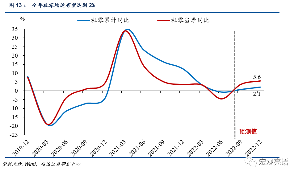 Wind显示,9月10号以后,我国防疫的严格指数降到了70以下,上一次的70以下还是在今年的3月份。如果四季度不发生大规模疫情,消费复苏的节奏大概率就不会被打断,社零在7月2.7%、8月5.4%增速的基础上,9月即使出现一些回调,三季度也有望实现3.7%左右的同比增速,四季度社零由于去年同期的基数不高,加上今年的一系列贷款,债券等增量工具和促消费政策的落地生效,当季有望实现5.6%左右的增速。全年社零增速有望达到2%。