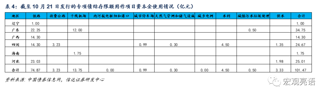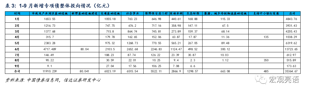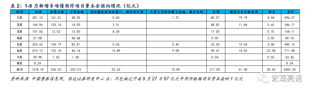 由于专项债券的发行者是地方政府,准确的是省级政府,所投的项目一般都是省内项目,基建中占比最大的是市政及产业园区基础设施,项目资本金中占比最大的是省内城际铁路。今年1-9月新增专项债用作项目资本金和整体投向情况如下:
