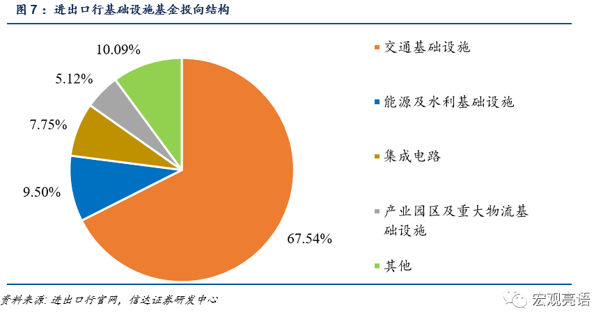 进出口行官网显示:684亿元向港口、机场、铁路、公路等交通基础设施领域投放基金462亿元;向能源基础设施领域投放基金65亿元;向产业园区及重大物流基础设施领域投放基金35亿元。
