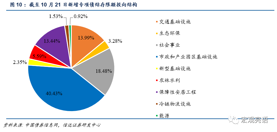 但实际中资本金占比并不高。1-9月新增专项债券用作项目资本金总量约为2455.24亿元,发行规模约为35364.67亿元(不包括9月底辽宁省67亿元结存限额的发行),占比仅为6.94%。5000多亿结存限额方面,截至10月21号,已发行了约1540.46亿元,用作项目资本金约为101.47亿元,占比约6.6%,资本金的比重没有出现提升。