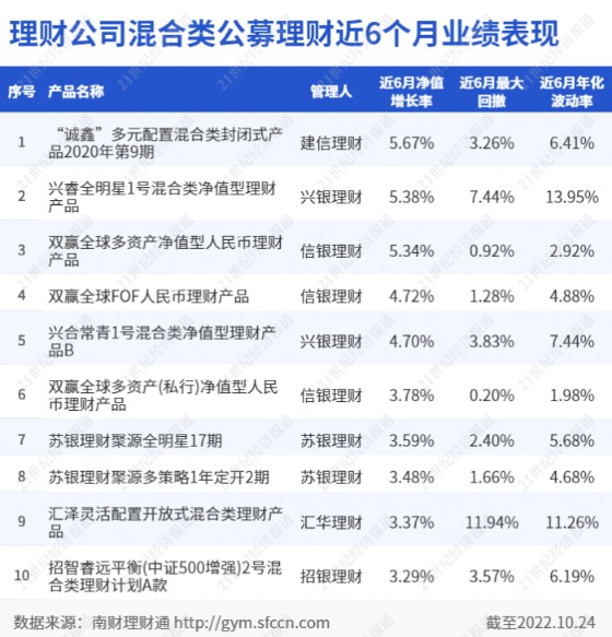 截至10月24日,在理财公司混合类公募产品近6月业绩榜单中,有6家理财公司的产品进入行业前10,分别是建信理财、兴银理财、信银理财、苏银理财、汇华理财和招银理财。其中,信银理财上榜3只产品,兴银理财和苏银理财各有2只产品上榜,其余3家理财公司则各上榜1只产品。